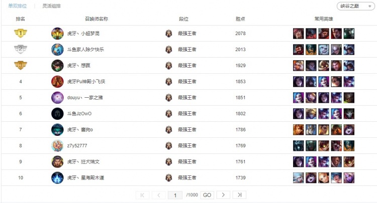 直播吧2月7日讯 根据WEGame数据统计,国服(峡谷之巅)排名前10的玩家为: