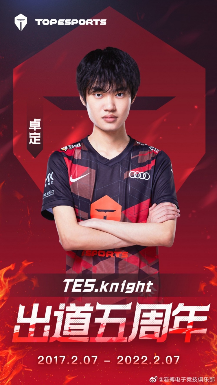 直播吧2月7日讯 今日是选手卓定(ID:Knight)奋战职业的第五个年头,TES官方也为Knight选手制作了出道五周年的庆祝海报,并附上寄语: