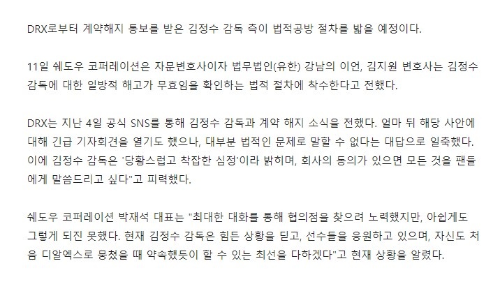 接到DRX解除合约通知的金晶洙主教练将发起法律上诉。
