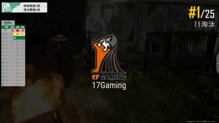 17先行找到Wuk独狼将其淘汰,随后在教堂外围的17和NH开战,一波投掷物攻势直接将NH压制,DDT趁机也开始加入战场。不过NH奋起反击,打掉DDT两人,反倒是17坐收渔翁之利,将两队淘汰吃鸡。