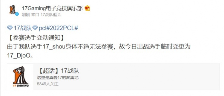 直播吧3月13日讯 今日17战队官博发布公告:由于我队选手17_shou身体不适无法参赛,故今日出战选手临时变更为17_DjoO。