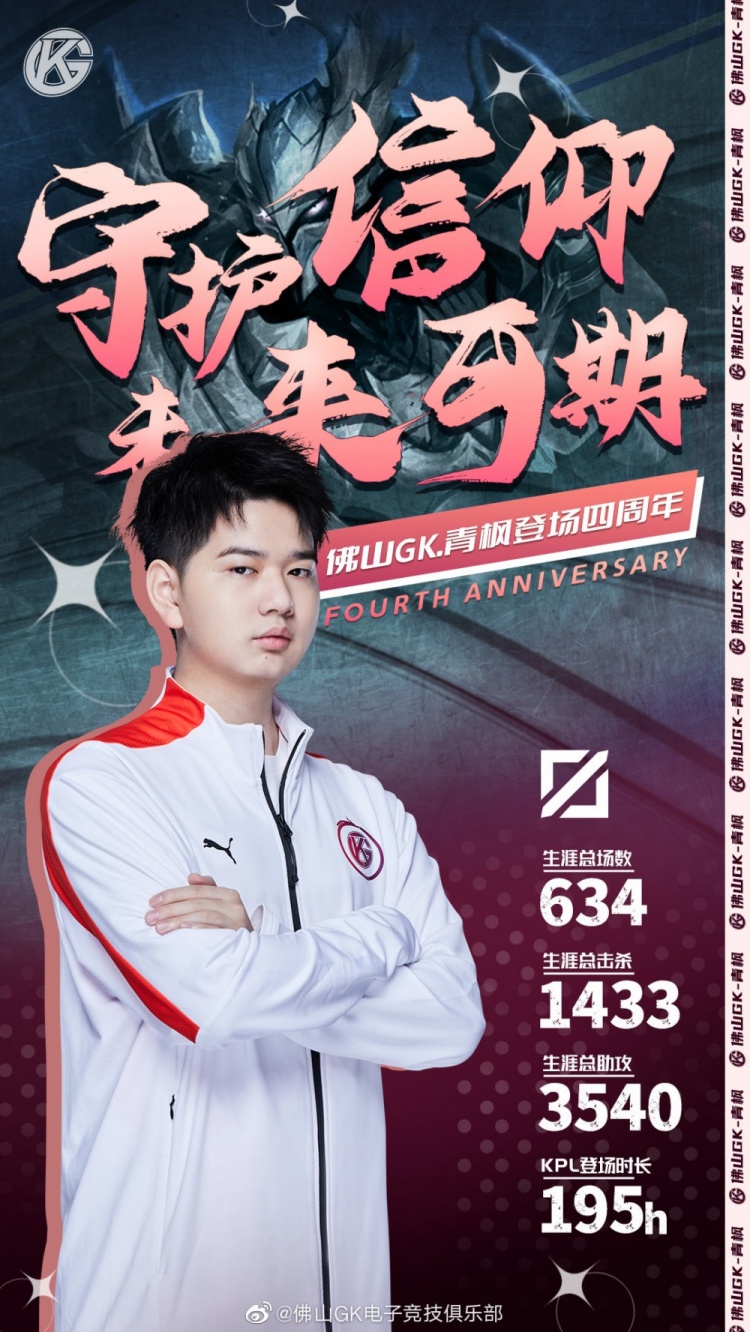直播吧3月22日讯 今天是佛山GK电子竞技俱乐部王者荣耀分部选手GK青枫登场四周年纪念日,佛山GK官博凌晨发文送祝福。