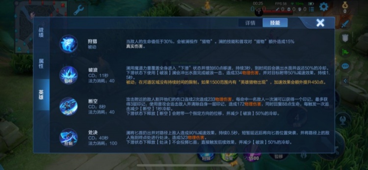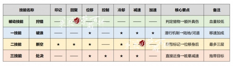 澜有着特殊的潜行机制且在河道下潜没有时间限制,若在1500范围内遇到残血目标,下潜状态中的澜将获得额外移速;澜二技能最多可获得三段强普,每次强普命中都将减少二技能1s冷却;澜三技能的霸体控制,是其常用的开团手段,巧至身后直接回推或是先手接大将目标聚集于一处,类似于鬼谷子的控制。