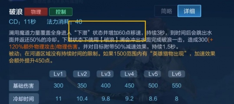 而这两点澜都具备,强化普攻可减少二技能CD,在满冷却的情况下,可以频繁的刷出强化普攻打出高额伤害,让自己快速刷完野区;一技能下潜之后,可获得60点移速加成,再加上在河道时可持续下潜,让澜有很强的转线跑图能力。