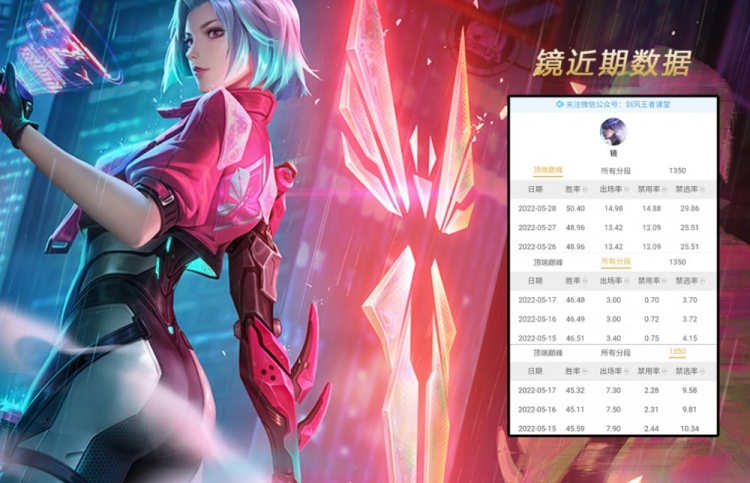 而到了高分段,在不缺手法的情况下,镜的上限被开发到了极致,使得其出场率达15%,禁用率15%,胜率更是在28号重回50%。