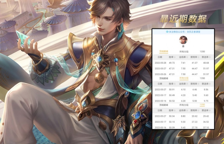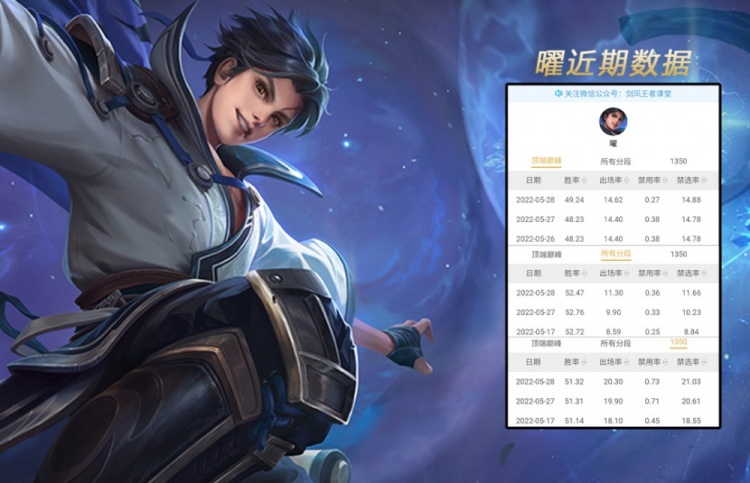 目前在巅峰赛1350分段,曜的出场率排第二名,并且胜率超过50%。