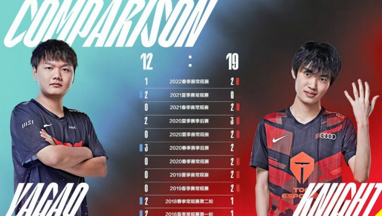 直播吧6月11日讯 2022LPL夏季赛今日的第二场JDG对阵TES的比赛刚刚开始,赛前官方直播间给出了两队中单选手历年交手战绩。Knight拿到7胜,Yagao为4胜。