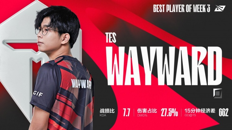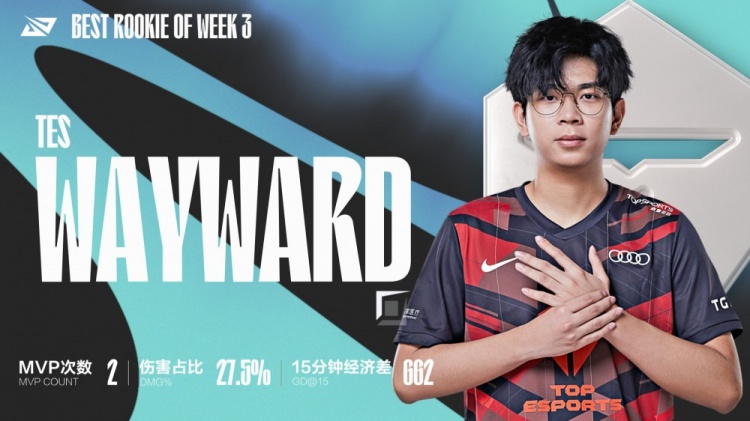 直播吧6月27日讯 刚刚英雄联盟赛事官方更新了第三周的MVP选手和最佳新秀,TES上单选手Wayward一人包揽两个奖项。