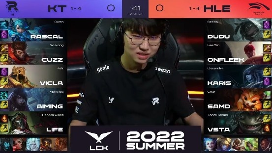 在双方BO3的首局较量中,前期Rascal格温依靠野区的一波完美收割加速发育,奠定了无解肥的个人节奏,随后KT逐渐滚大经济雪球,中期稳健控下大龙buff后团灭HLE一波结束比赛!