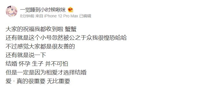 刚刚Letme妻子更新微博称:结婚 怀孕 生子 并不可怕,但是一定是因为相爱才选择结婚,爱 · 真的很重要 无比重要。