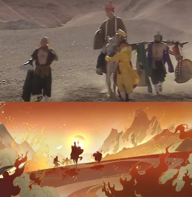 出场动画里用电影胶片处理的更加艺术化,还原了火焰山借芭蕉扇,师徒同渡难关的经典剧情。