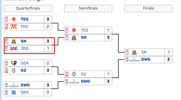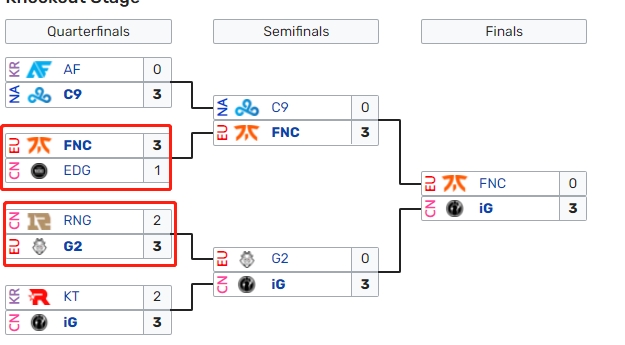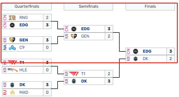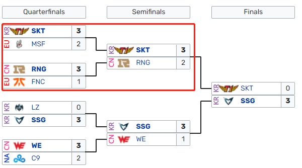 四分之一决赛上,RNG与EDG均不敌韩国队伍SKT和ROX Tiger八强出局结束世界赛。
