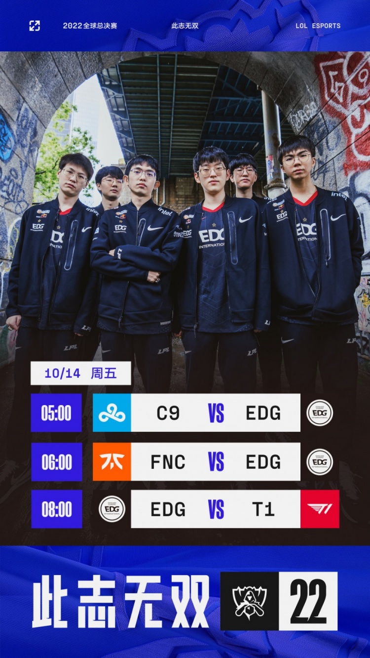 直播吧10月13日讯 2022英雄联盟全球总决赛小组赛A组出线晋级战明日开启,EDG战队赛程预告如下: