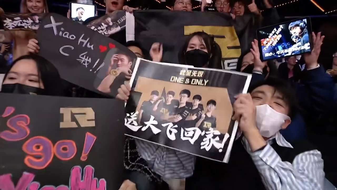 直播吧10月22日讯 S12四分之一决赛RNG VS T1正在进行,比赛选手入场时,有RNG粉丝举应援牌“搞事”:送大飞回家!Xiaohu C我?
