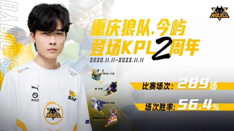 直播吧11月11日讯 今天是狼队王者荣耀分部选手今屿KPL登场2周年纪念日。2020.11.11-2022.11.11 时光见证坚持,努力不会辜负。