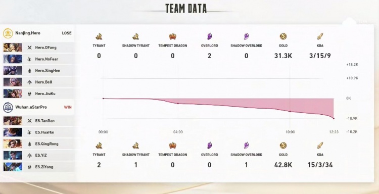 【9:50】Hero上路五人带线想拆二塔,坦然大闪击飞五个强拆电梯留下五人。ES打出一波一换三。下路带线的狄仁杰还把高地破掉。