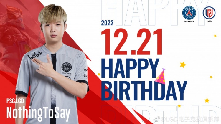 直播吧12月21日讯 今天是LGD电子竞技俱乐部Dota2分部NothingToSay的生日,LGD官博凌晨准时更新,送上生日祝福。