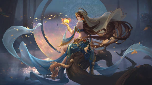整体颜色以蓝色和金色为主,正如金色月光洒在圣泉之蓝上,花朵的装饰凸显她美丽动人的特质,手上放置的是圣泉边最后一朵花儿,体现了女神对万事万物的怜悯之情。华丽的宝石和金饰闪闪发光,若隐若现的面纱下是女神绝美的容颜。