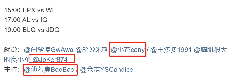 直播吧1月13日讯 2023LPL春季赛1月14日正式开赛,赛前英雄联盟赛事官方发布解说和主持人员名单,阔别LPL赛场多年的解说小苍、解说Joker悉数回归舞台,同时主持人除了余霜,还有在LPL年度盛典表现出色的Baobao。