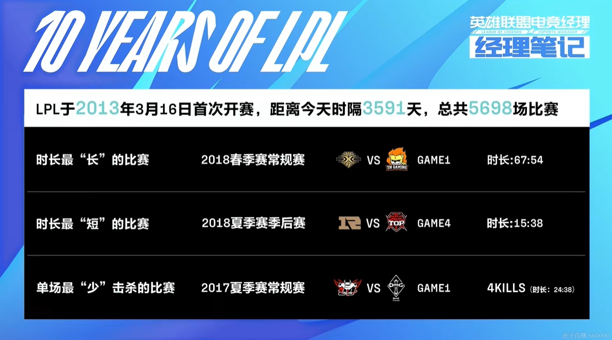 直播吧1月14日讯 今日英雄联盟赛事官方直播间放出LPL十年来一些令人印象深刻的赛场纪录。