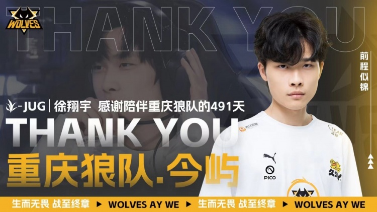 感谢今屿选手陪伴重庆狼队走过的491天。我们相遇在21年的金色之秋,携手征战一年有余,为共同的目标日夜奋斗。力挽狂“澜”,无“屿”伦比,赛场之上你是当之无愧的野王,多次carry全场为队伍带来胜利;赛场之下你是好动的小男孩,不会忘记活泼的你在照片中各种搞怪的模样。