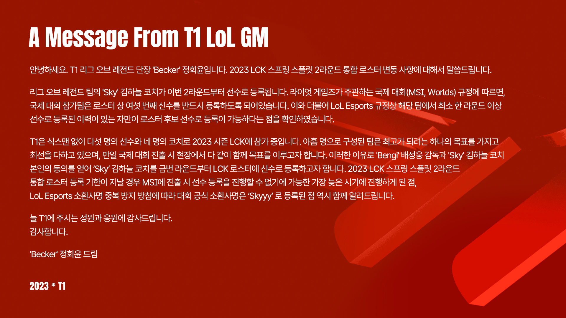 “大家好,我是T1英雄联盟总经理Becker,我将告知大家2023LCK春季赛第二轮综合大名单的变动情况。