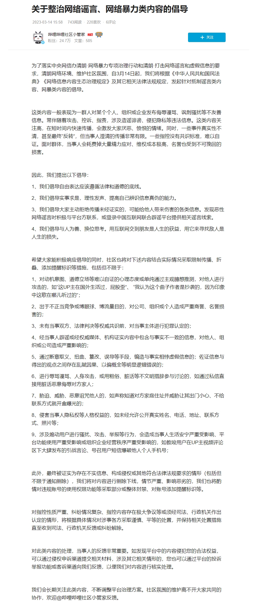 近日,B站发布《关于整治网络谣言、网络暴力类内容的倡导》,宣布将持续整治谣言、网暴类内容,打击“造谣传谣”、“网络爆破”等违规行为,维护社区氛围与网络环境。此外,针对组织、企业发布不友善信息的行为,也首次被B站纳入到治理范畴内。