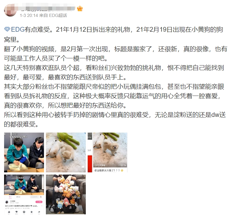 直播吧3月16日讯 近日EDG超话中有位粉丝“开团”前中单选手Scout,表示自己发现粉丝在2021年给Scout选手送的玩偶礼物疑似转手被扔在了狗窝里。