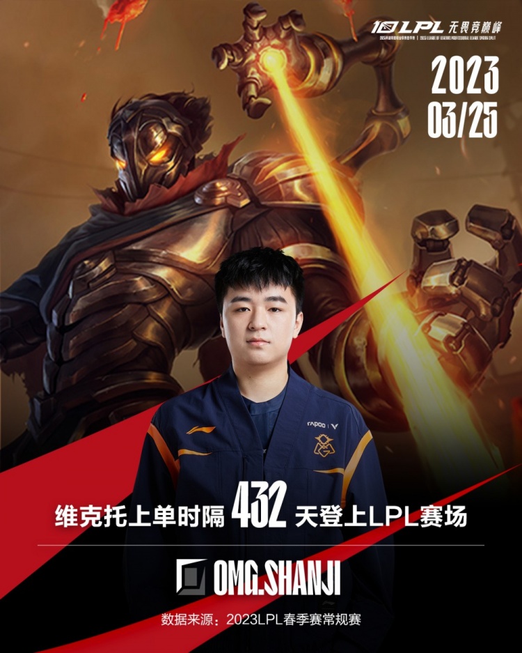 直播吧3月25日讯 在今日BLG对战OMG的比赛中,OMG.shanji选手选出维克托上单。此为上单维克托时隔432天登上LPL赛场,上一次在上单位置被选用,是在2022年1月16日2022LPL春季赛WBG vs BLG,使用选手为TheShy。