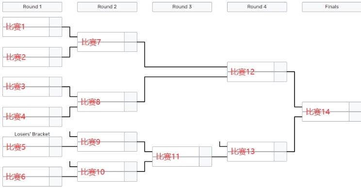 比赛5/6的胜者晋级比赛9/10,比赛5/6的负者淘汰,比赛7/8的胜者晋级比赛12,负者来到比赛9/10,以此类推直指最终比赛14决赛。