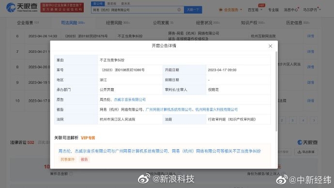 直播吧4月10日讯 天眼查App显示,近日,广州网易计算机系统有限公司、网易(杭州)网络有限公司、杭州网易雷火科技有限公司新增一则开庭公告,案由为不正当竞争纠纷,原告为周杰伦及杰威尔音乐有限公司,该案将于4月17日在浙江省杭州市滨江区人民法院开庭审理。