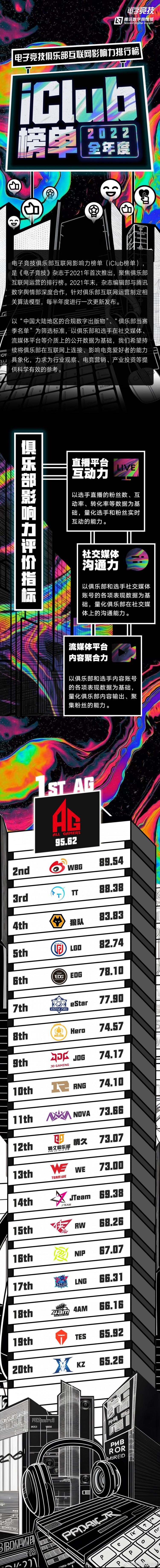 直播吧4月19日讯 今日电子竞技杂志官博更新,发布2022全年度电子竞技俱乐部互联网影响力排行iClub榜单,AG蝉联榜首,与WBG、TT继续霸占TOP3。