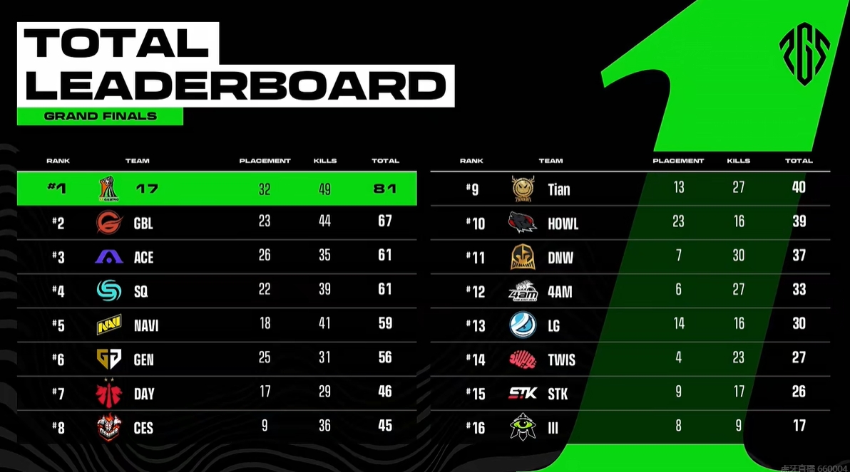 直播吧5月6日讯 今日PGS决赛第二日的比赛正式打响,参赛战队有:NAVI 、DAY、Tianba 、CES、HOWL、SQ、4AM 、DNW、TWIS、GBL、LG、GenG 、17 、STK、III、ACE