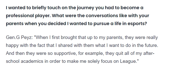 直播吧5月11日讯 MSI胜败分组赛第一轮GEN击败G2后,Peyz选手接受外媒专访,在回答家庭对其从事电竞的意见时,其表示: