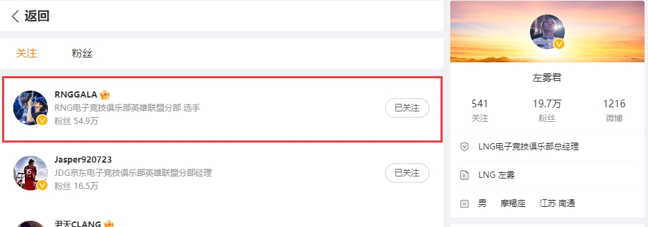 >坐等官宣?LNG经理左雾微博关注RNG下路选手GALA