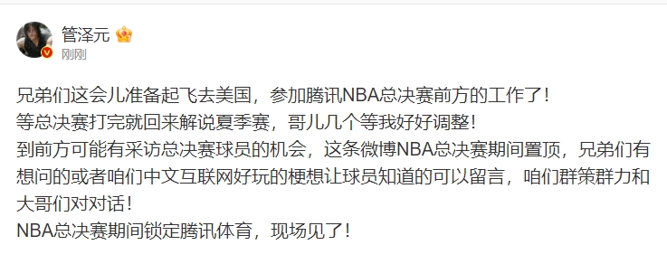 直播吧5月28日讯 今日三栖解说管泽元更新微博宣布,自己准备飞美国参加腾讯邀请的NBA总决赛前方的工作!到前方可能有采访总决赛球员的机会,兄弟们有想问的或者咱们中文互联网好玩的梗想让球员知道的可以留言。