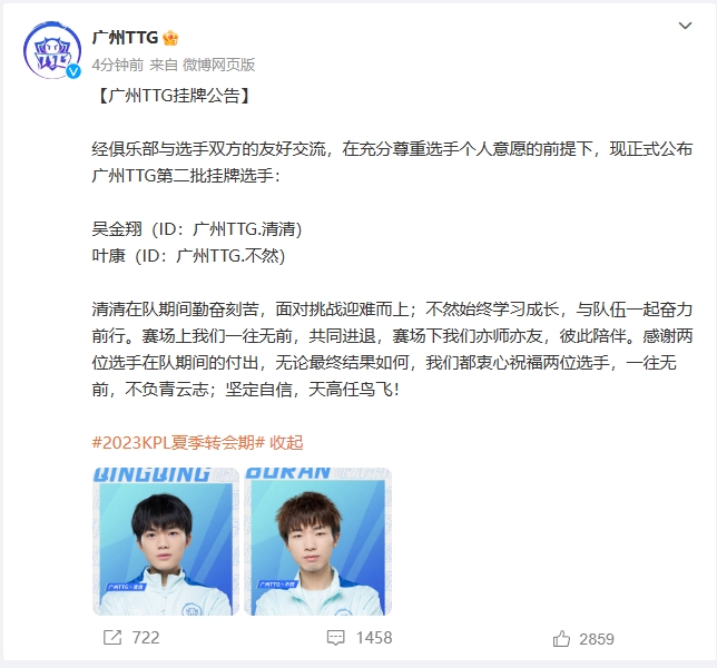 >广州TTG官方公告:对抗路清清、打野不然 两位选手将挂牌
