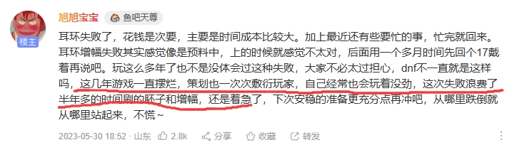 直播吧5月31日讯 近期DNF直播一哥旭旭宝宝为了游戏内打造出增幅+18的耳环,耗时半年累计花费在1000万-1500万之间,但颗粒无收以失败告终。