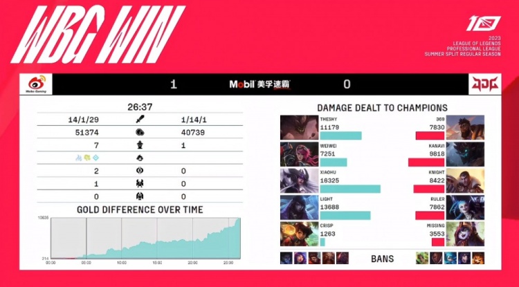 【23:50】WBG下路推进,JDG四人守塔,璐璐与茂凯先行阵亡,厄斐琉斯喷火爆炸,金克丝中路收掉石头人,辛德拉收掉杰斯后追杀奎桑提未果,WBG打出1换3,经济领先6K。