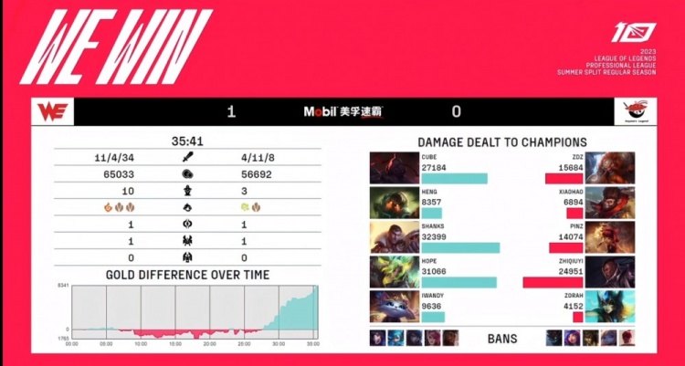 【35:06】WE推掉中路高地转上,pinz安妮在侧面想开团吃到Heng泰坦一钩直接被秒!进场的Xiaohao猴子也没能幸免,Hope泽丽带猫双杀!WE打出0换2之后直接推家拿下首局比赛!