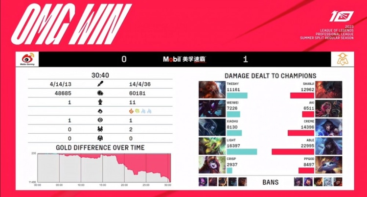 首局OMG给shanji选出剑魔线上压制TheShy酒桶,TheShy酒桶利用一个绕后TP帮助队伍打回一波,中期OMG利用先锋撞残了中一塔,随后抱团推塔,抓住WBG上中绕后TP赶来的时间差AKi蔚直接锁头Light泽丽,双C收割团灭WBG之后奠定优势!随后的比赛带猫的Able厄斐琉斯肆意收割,WBG没人可以抗住OMG上中下三C的伤害!OMG拿下二大龙推掉三路高地,成功拿下首局!
