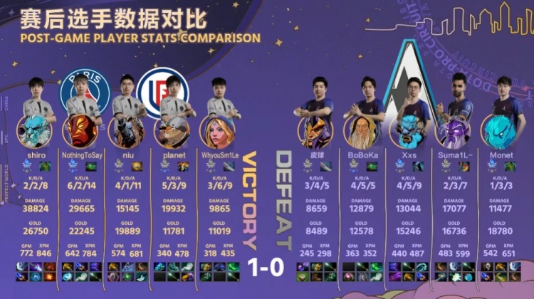 对线期XXS白牛打出优势经济领跑全场,白牛拿到隐刀之后连续带节奏击杀LGD酱油,shiro猴子一直在三角区带着猛犸buff发育经济成功完成反超,对位领先水人一个大件。后期团战猴子成功团战瞬间解决茶队酱油,水人也扛不住猴子输出被击溃。LGD利用猴子强势期平推拿下第一局。