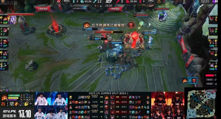 【12:50】WBG在上路的配合有点没接上,Able厄斐琉斯和Weiwei蔚互换!Creme奎桑提和TheShy酒桶交出TP,双方拉开!