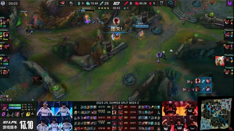 【37:41】AL中路推进,兰博被妖姬踩到半血后瞬间阵亡,野区TT四打五,厄斐琉斯先拿双杀,洛与妖姬瞬间倒地,奎桑提反手收掉猪妹与璐璐拿到双杀,盲僧收掉杰斯,AL打出2换5团灭TT,一波推平TT基地扳回一局。