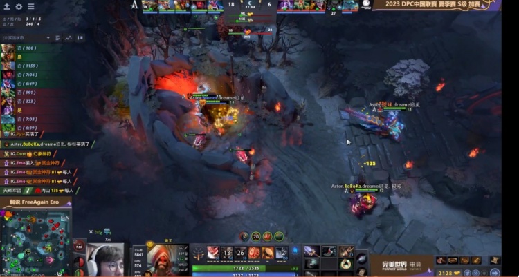 【25分钟】肉山争夺战iG先占位置,Aster开雾绕后,Sumail老奶奶开炮瞬间秒掉qyqx骨法,qyqx交出买活,Dust美杜莎吃到皮球萨尔大招和其他技能还被幻象攻击,魔被打空也被秒掉!回头Sumail的电炎绝手也被项羽的伐木机换掉!双方交出买活,Monet大圣还能开出BKB收割残局!项羽的伐木机被萨尔D回,和qyqx骨法一起再次阵亡!Aster大获全胜,拿下二代肉山!