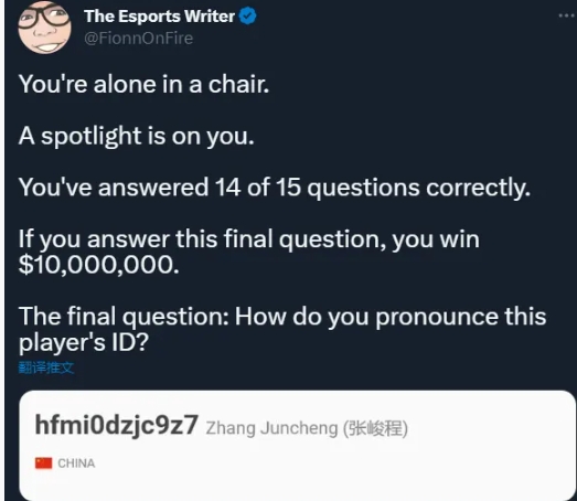 而外媒记者FionnOnFire更新一条推特吐槽无畏契约中国战队ASE某选手的怪异ID:你告诉我“hfmi0dzjc9z7”怎么读?