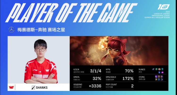 第一局双方平稳发育,UP在先锋团拿下一血,但是Cube塞恩借助运营思路上下两路一塔全吃实现超前发育!中期Cube的塞恩可以顶着UP五个人做视野,WE利用Shanks安妮绕后和Cube泥头车成功分割战场打出一波0换3之后收下大龙!彻底奠定胜势!后续WE推进下路高地,UP想动手Hope金克丝自家上野反而双双倒下,WE趁势抱团一波结束比赛!
