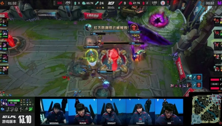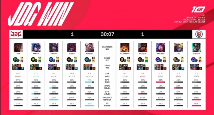 JDG:上单369、打野Kanavi、中单knight、下路Ruler、辅助MISSING