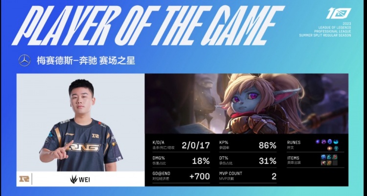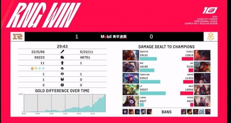 首局比赛Creme阿卡丽中路对线坐牢还时不时要被Wei波比骚扰!下路也是RNG泽丽璐璐线权,OMG只能依靠shanji剑魔在上路拿下对线压制!RNG利用中下优势不断拿下小龙,关键的龙魂团Tangyuan妮蔻侧翼闪现进场配合LP泽丽爆大瞬间收割,RNG拿下海克斯龙魂+大龙之后没给OMG任何机会,直接推掉三路高地!OMG背水一战但是Creme阿卡丽进场直接白给,shanji剑魔团战不断被拉扯无能为力,RNG团灭OMG拿下第一局的胜利!
