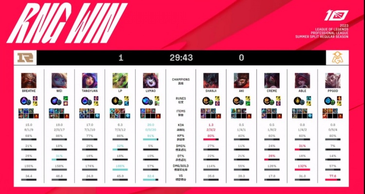 RNG:上单Breathe、打野Wei、中单Tangyuan、下路LP、辅助LvMao